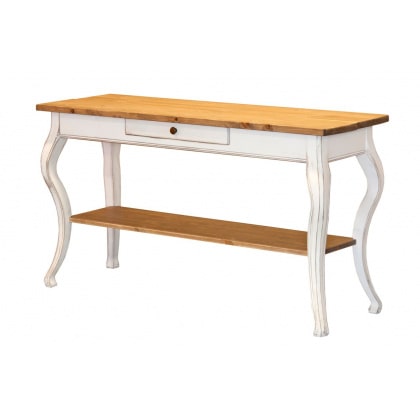 Antiikses stiilis täispuidust sahtliga kõrge abilaud. Mõõdud: 138x46x kõrgus 76cm Viimistlus: Lauajalad töödeldud valge peitsiga ja lauaplaat antiikpeitsiga. Samas sarjas olemas Tv alus, diivanilaud, söögilaud Toodetud Eestis!