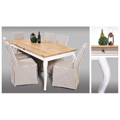 Antiikses stiilis täispuidust sahtliga söögilaud. Mõõdud: 180x93x kõrgus77cm. Viimistlus: Lauajalad töödeldud valge peitsiga ja lauaplaat antiikpeitsiga. Samas sarjas olemas Tv alus, kõrge abilaud, diivanilauad. Toodetud Eestis!