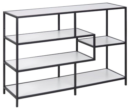Riiul mis on tehtud mustast metallkarkassist. Riiuli vaheplaadid on lamineeritud kattega mööbliplaadist ning viimistletud valge ja musta puiduga.